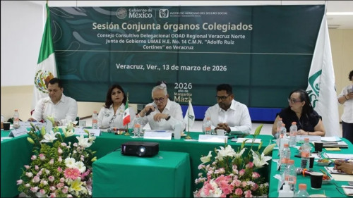 Ante el doctor Gaviño Ambriz, la representante del IMSS en la región Veracruz Norte, doctora Edith Jiménez Martínez y el director de la UMAE, Hospital de Especialidades No.14 del Centro Médico Nacional “Adolfo Ruiz Cortines”, doctor Víctor Bernal Dolores, reiteró que la representación del sector patronal respalda y acompaña a la institución para concretar los proyectos que tienen programados en 2026.