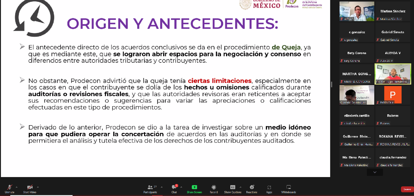 Explicaron a los participantes que esta figura está inmersa en el Código Fiscal de la Federación y la Prodecon está facultada para intervenir cuando sea el caso, para solucionar controversias.