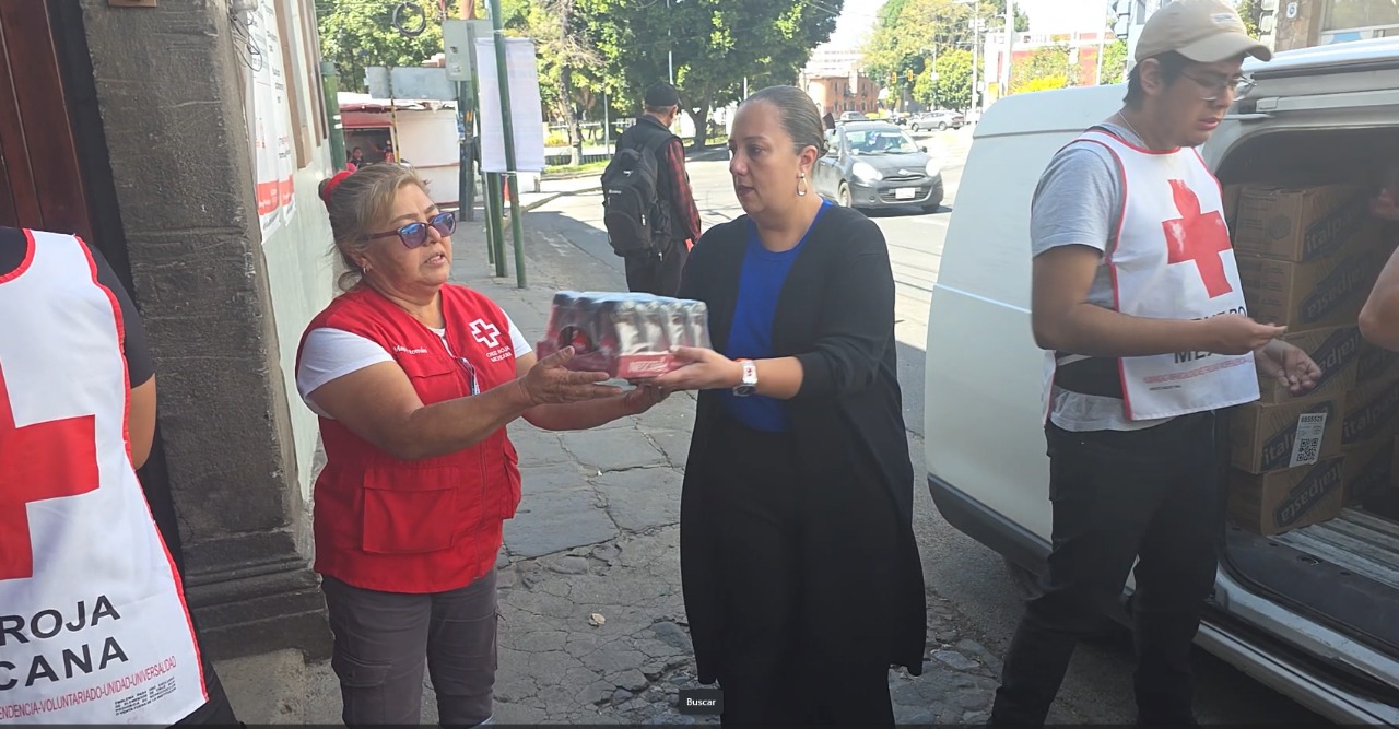 Mientras tanto en la Delegación de Cruz Roja Puebla, la Directora Ejecutiva de la FGCM, Maestra, Mayra Fritsche García, acudió a las oficinas para realizar la donación de las despensas que recibió la Licenciada Gisela Gutiérrez Ortíz, asistente de la delegada Paula Saukko de Murrieta.